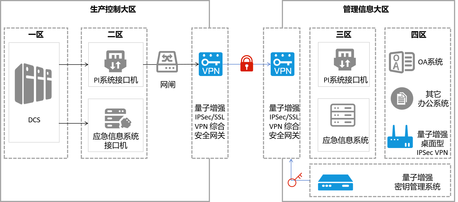 第二,通过对量子保密通信关键技术的研究,结合电力工控网络面临的安全需求,研制基于量子密钥分发技术的量子安全加密系统,应用于电力网络边界区域,解决 DCS 等工业控制系统跨区域传递数据面临的安全风险。
