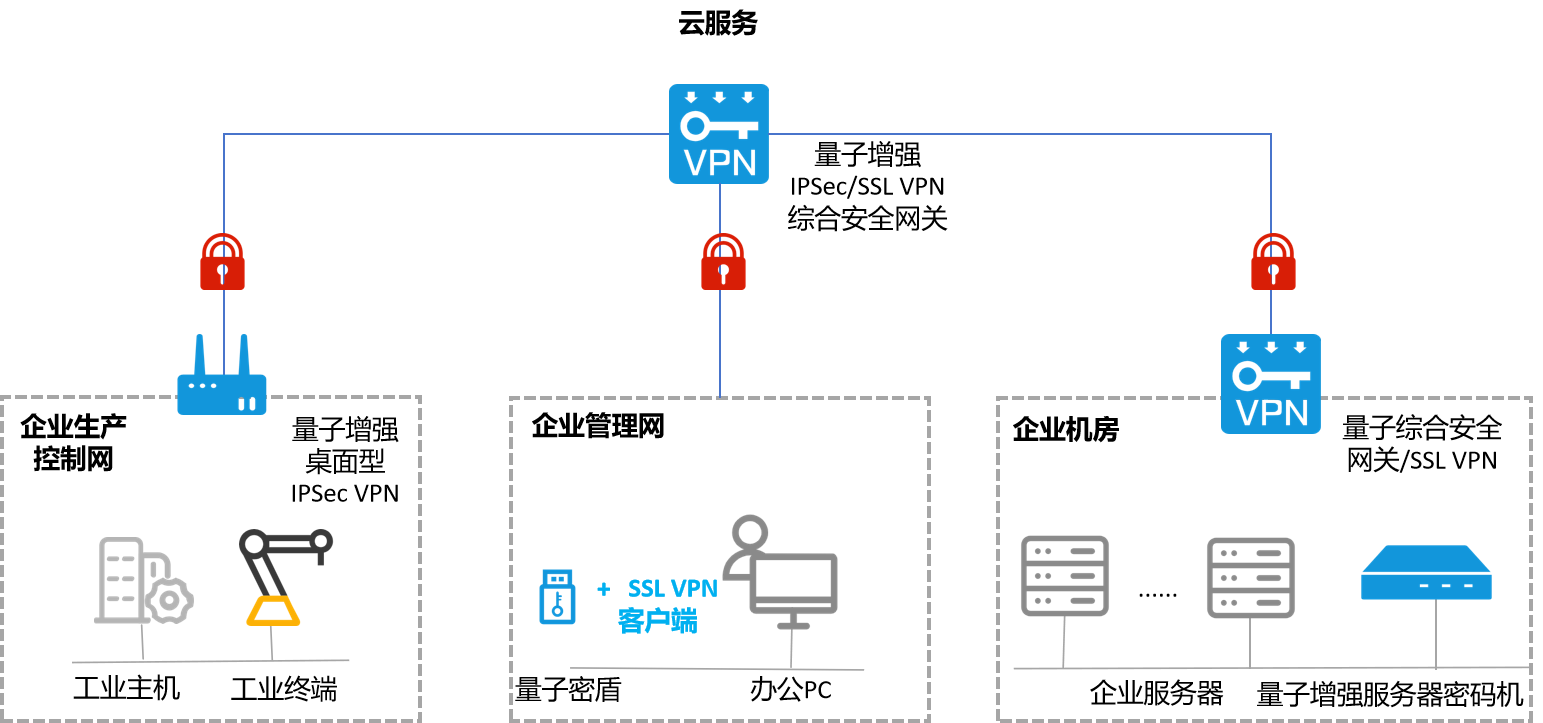 本方案在企业机房部署量子VPN综合安全网关 /SSL VPN+ 量子服务器密码机;