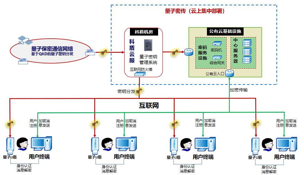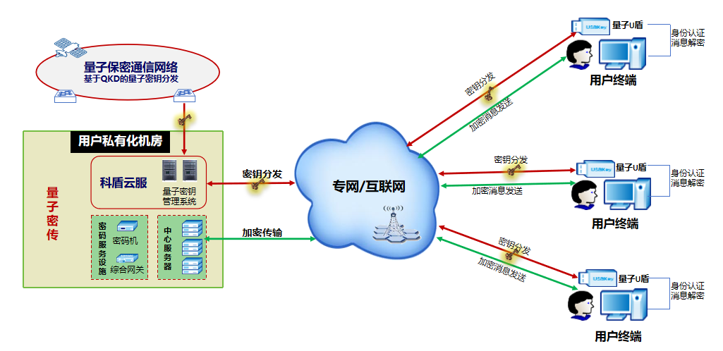 混合动态密码模块算法中的基础密码,采用国家密码局颁发的SM系列算法;密码芯片等核心部件,采用符合国家密码局标准的国产化产品;量子密钥分发系统,采用量子增强密钥管理平台、服务器密码机及智能密码钥匙等均为国产化自主可控的核心设备。由此,提升了消息的在网络传输过程中的安全可靠能力。